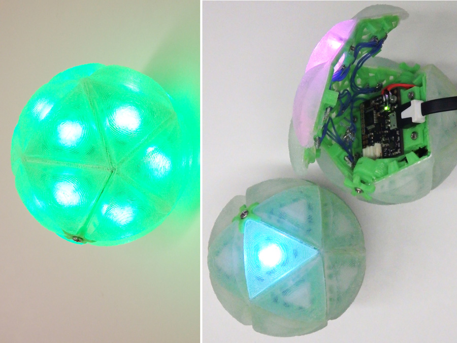The IcosaLEDron is a programmable, rechargeable 20 sided “ball” with an addressable RGB LED on each face. Inside is a custom PCB equipped with Atmega328p, 3-axis accelerometer/ gyroscope/ magnetometer, and FTDI with microUSB communication and charging. Arduino compatible for easy programming of different effects, the IcosaLEDron is a platform for creating light effects based on accelerations applied to the ball.